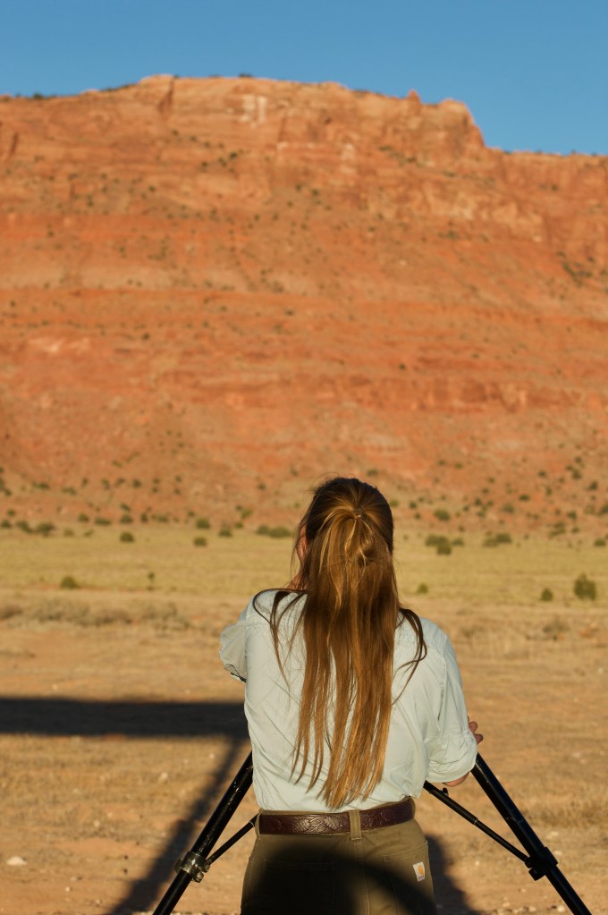 The cliff she was looking at was three miles away. The scope shows us a white mass where six were gathering in a place known as the local bar. The team of ornithologists watches them at sunset to be sure they nest safely. They make easy prey for mountain lions and coyotes if they aren’t tucked in for the night. A simple scatter by her team member on top of the cliff encourages a safe ledge.