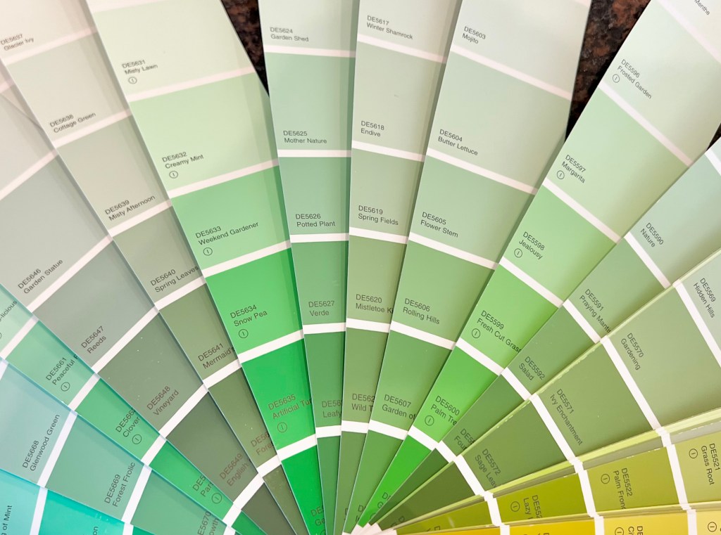 I can’t help but to think of the entire spectrum. I love mint chocolate-chip ice cream, the pistachio walls in my office, and my sea-foam nail polish.