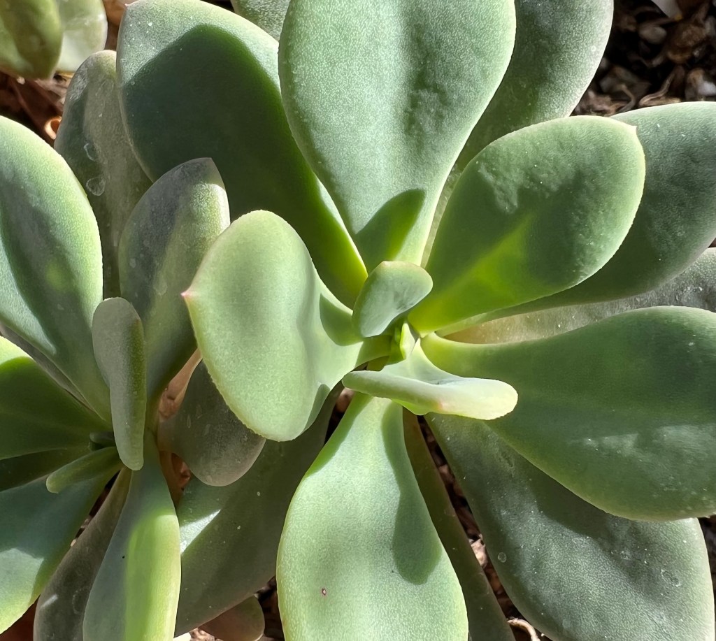 In Arizona, our succulents and cacti are subtle, more of a jade green. Most are light-colored because of the microscopic hairs on the leaves to protect them from the brutal sun.