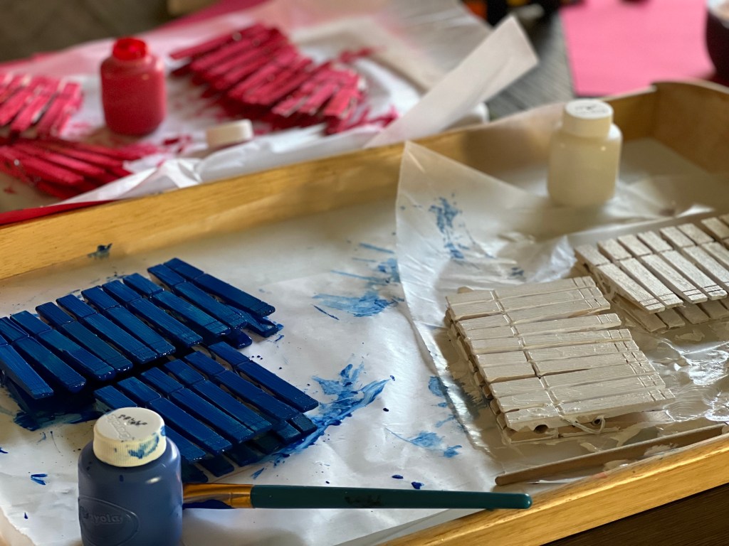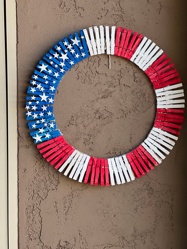 I relearned this during July. I bought a table for the office/multi-purpose room in my home. The sole (or is it soul) purpose was to have a creative art space. My husband likes models, the grandkids love legos, play dough, puzzles, and paint etc… And everyone loves to explore what might be new on the table. My first project was for me. I painted clothes pins, stuck them on a wire ring, and decorated it with stars for an easy Forth of July activity. My creative expression is reflective in my house and garden.