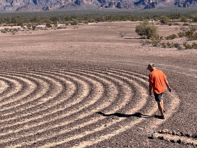 Our first exploration was the Ko-kopelli Spiral. I can give you general directions, but it is pretty much in the middle of nowhere, and is an anomaly. No one knows why it is here, who made it or what the history is. People who come here find it meditative and walk the spiral to the center, a journey, and they leave trinkets as gift. It took me 9 minutes and 37 seconds to walk to the center and my shadow traveled around me 28 times.