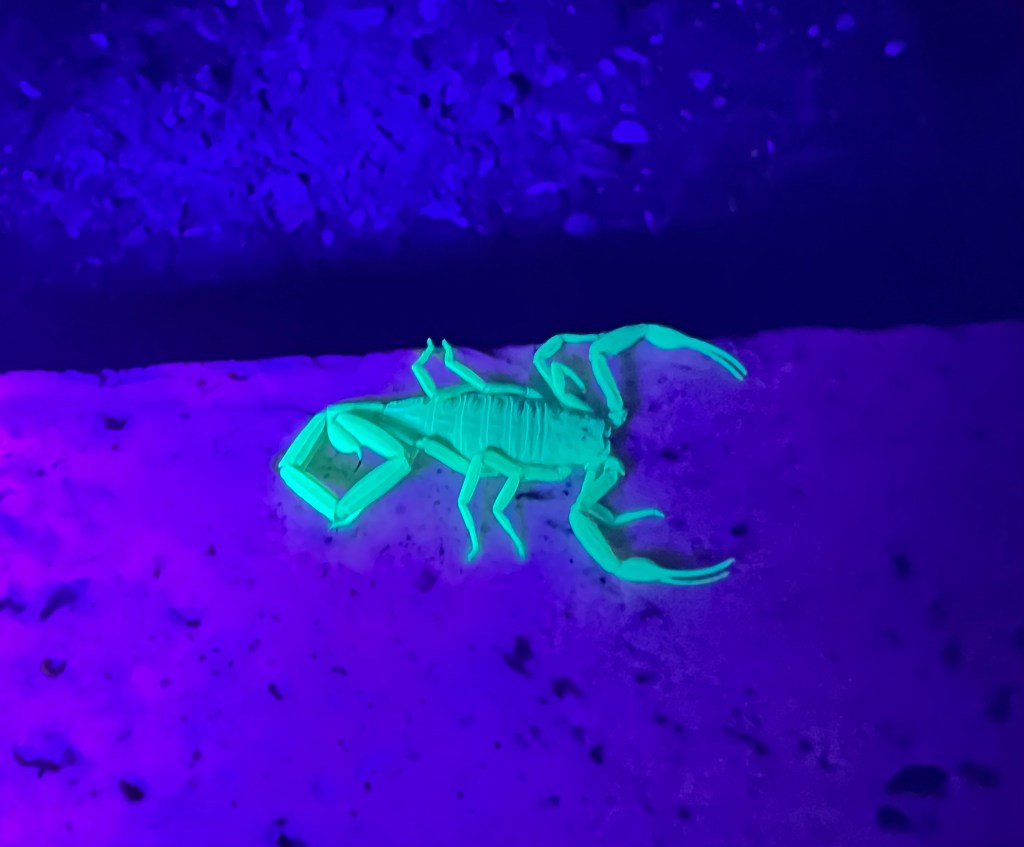 And wait… there are times you might think your light is too small to shine. Trust me…even the smallest light can radiate a huge impact on the lives of others. Yup…It is scorpion season in the desert. For those unfamiliar to the desert, scorpions do glow when exposed to UV light. It is due to the presence of beta carboline in their exoskeleton.