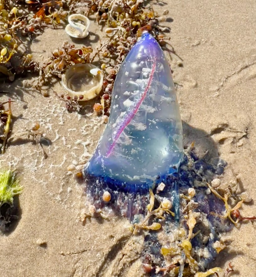 In reality, they are quite dangerous, venomous, even when dead. They are not jellyfish as I thought and instead known as a siphonophore, a colony of organisms working together. There is a gas-filled float, two types of tentacles, and the reproductive system. They look and sting like a jellyfish, but they don’t swim. They travel with the wind and ocean currents, sometimes in legions of 1000 or more.