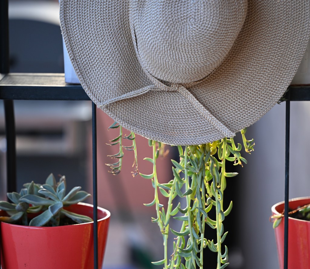 The garden gets a once-over before I head in for the day. It continues to make the effort, and I chuckle when I notice my hat hanging on the succulent shelf. The dolphin plant looks like a mane of hair today. A simple pleasure.