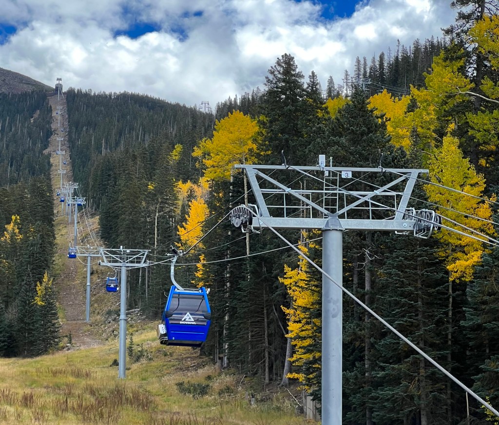 While visiting Flagstaff, I fell in love with the way the gondolas mimic the color of the sky. And do you agree, the aspens offer a brilliant contrast? I think what brings cohesion to the photo, is the rhythm of the gondolas that carry your view up to Agassiz Peak.