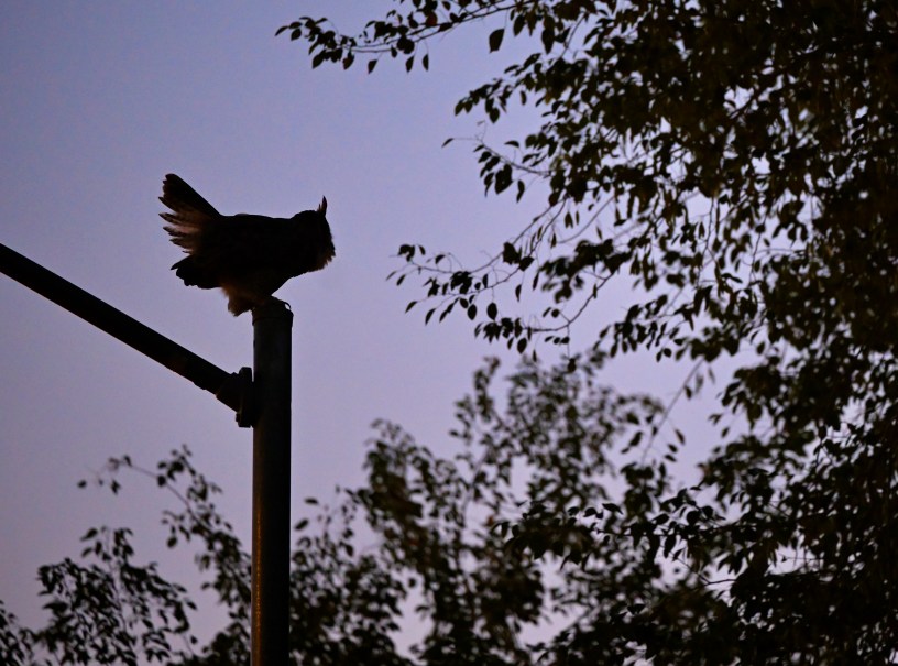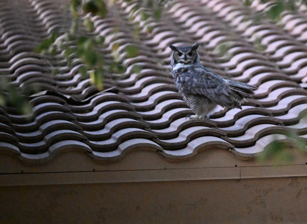 I heard it before I saw it. The deep, soft hoots with telltale rhythm is the clue. It is always that way with a Great-Horned Owl…or two. We see them from time to time since we live on the edge of the desert, but today it sounded like more of a duet. One hoot answered with another higher-pitched hoot. A female?