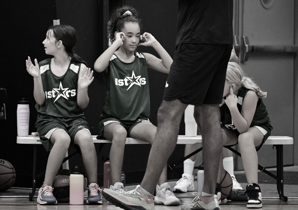 The photo above shows three girls preparing for a game-end buzzer. Their ears are covered, one looks towards the clock, and they clearly anticipate the loud blare. It is a great example of how we might not hear pictures, but we can see certain images and think of sound.
