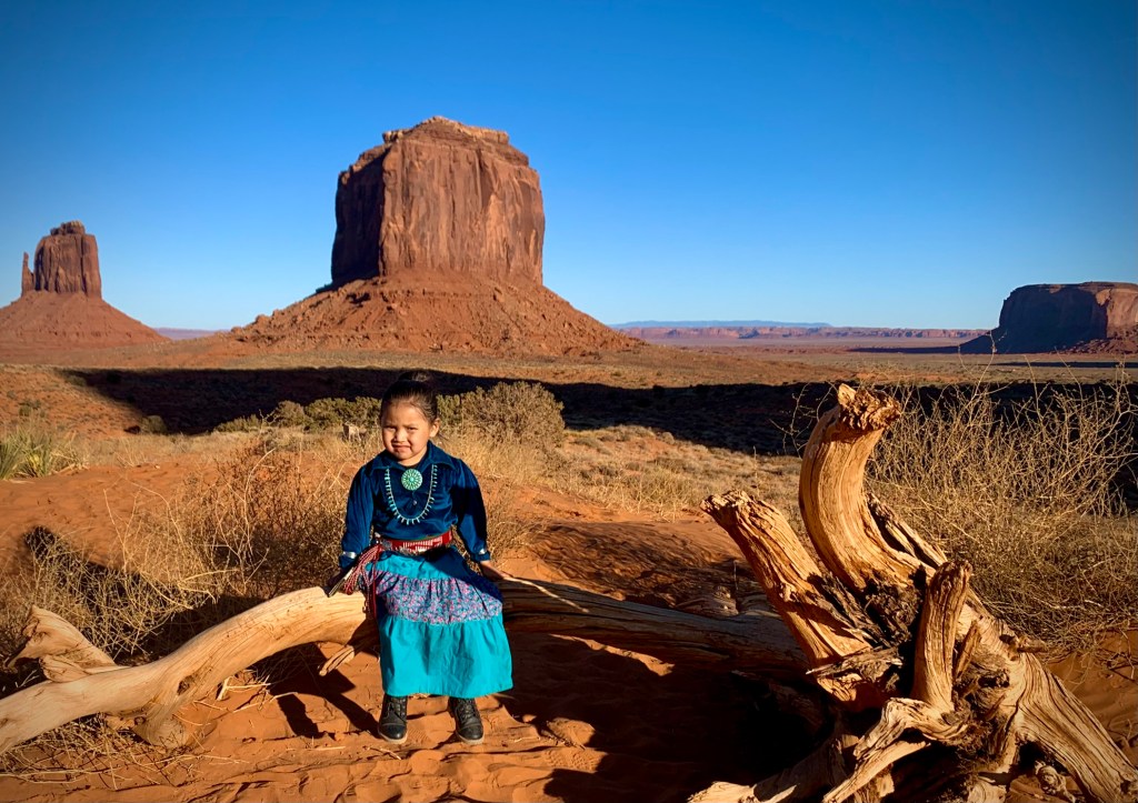 If you look in the left corner you will see the mitten butte from it’s silhouette above. I know the direction of the sun is too bright for the girl’s face, but do you notice the shadows that bring depth and form to the buttes? Do you notice the intricate shapes of her jewelry? Do you notice the texture of the sand and the dead tree that acts like a stage in this beautiful place she calls home?