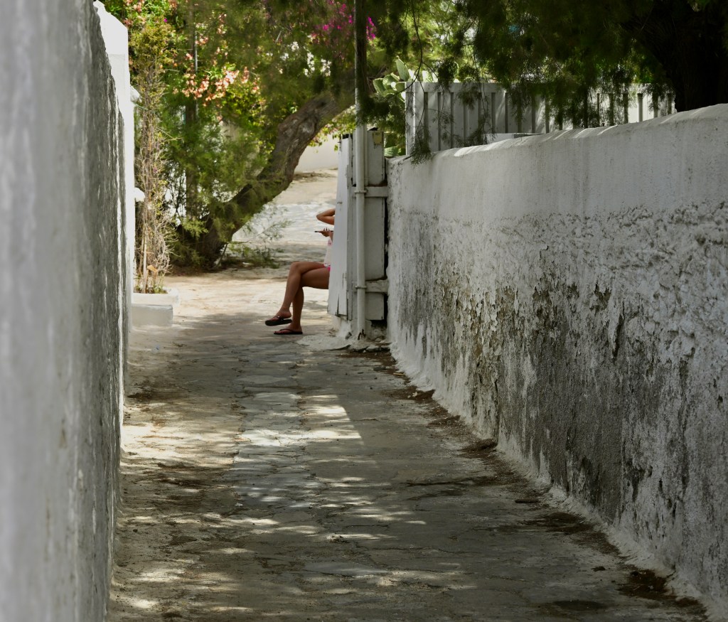 Juxtaposition: I watched the girl in red for some time from a restaurant in Mykonos, Greece. An interesting view, don’t you think? And even though none of us like the big cruise ships dominating the seascape, the composition for this is one I love.